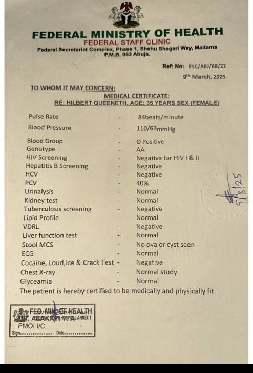 Nollywood actress Queeneth Hilbert has given netizens something new to talk about amid her online spat with Destiny Etiko She … Continue reading Queeneth Hilbert Posts Medical Report After Substance Abuse Allegation Amid Fight With Destiny Etiiko